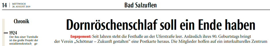 Die Stadt hätte jetzt die einmalige Chance, für ihre nicht genutzte und sanierungsbedürftige Immobilie Festhalle Schötmar Fördermittel zu bekommen. Ideen, Ansätze und Beteiligungsangebote, die ja auch Ihr Verein gegenüber der Stadt vorgetragen hat, wurden bislang nicht aufgegriffen. Das stimmt mich schon sehr traurig.
